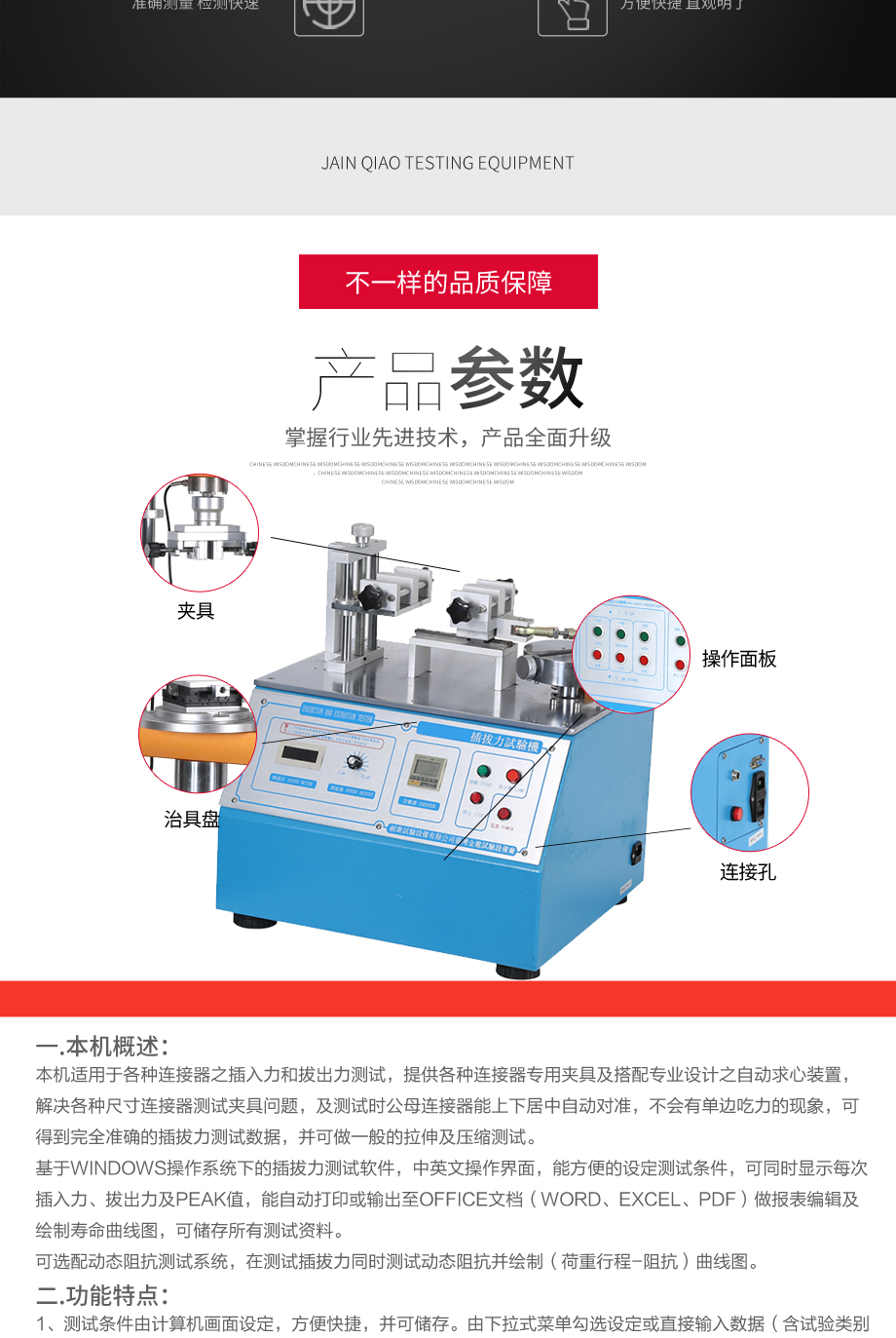適用各類插頭座、USB等連接器的插拔試驗(yàn)之用??蓪?shí)時(shí)顯示連續(xù)值,插入峰值,拔出峰值具有自動(dòng)計(jì)數(shù)功能,行程速度可隨意調(diào)節(jié),并且顯示速度值,測(cè)試數(shù)據(jù)可保存、查看、打印,可擴(kuò)展連計(jì)...