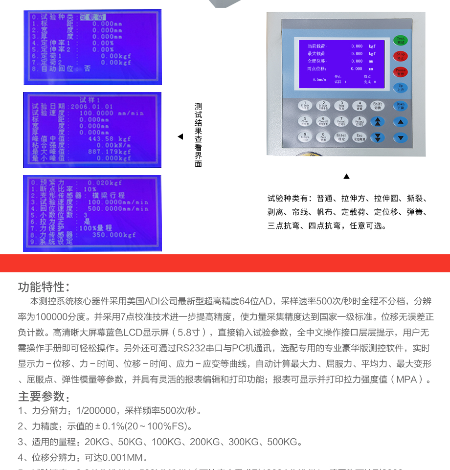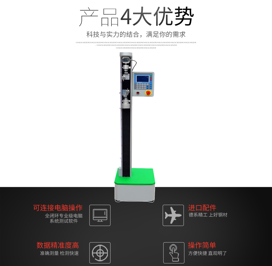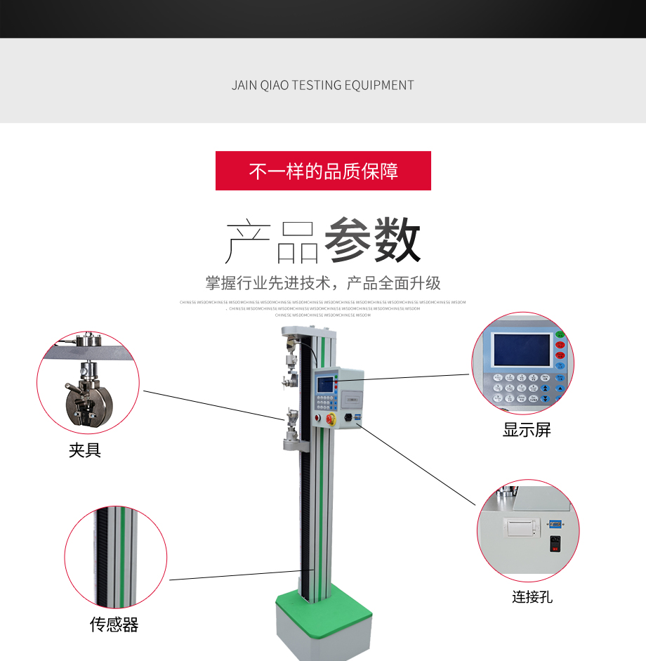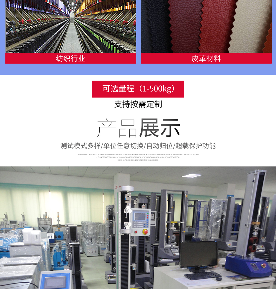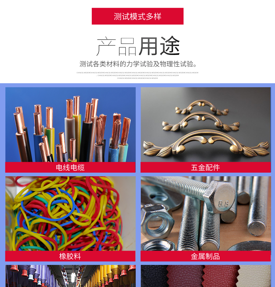 本系列機廣泛用于各類五金、橡膠制品、鞋類、皮革、服裝、紡織、建材、絕緣體、電線、電纜、端子等各類材料。測試其拉伸、撕裂、剝離、抗壓、彎曲、抗剪切、定荷重、定位移...
