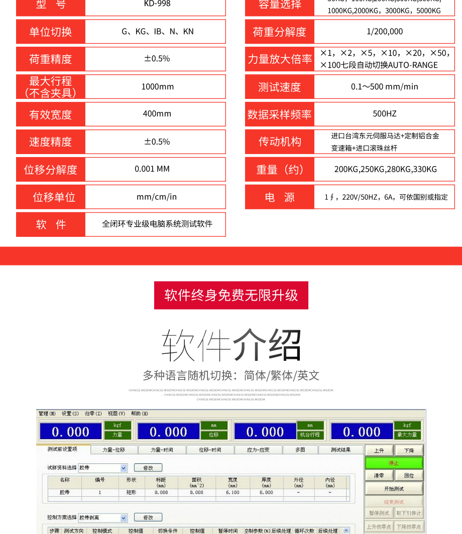 高端雙柱拉力機KD-998主要測試原物料、成品、半成品的物理特性,可做抗拉力測試、抗壓力測試、抗彎測試,取得伸長量、伸長率、應力、應變等測試結果及測試資料。...